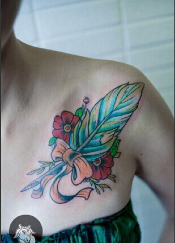 女生胸前唯美漂亮的彩色羽毛花朵纹身图片