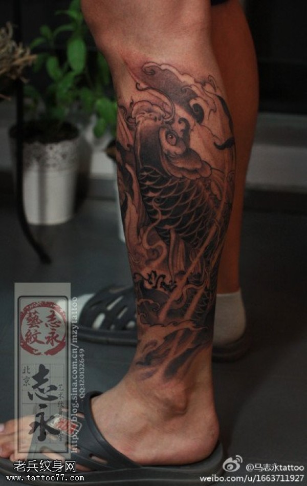 传统鲤鱼花小腿纹身_腿部纹身图案大全_纹身图吧