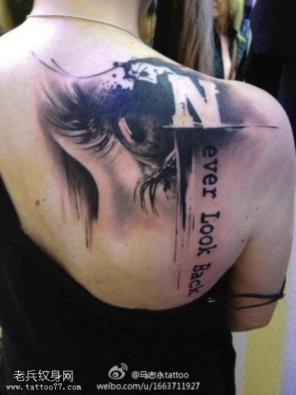 肩部单纯英文眼睛纹身图案