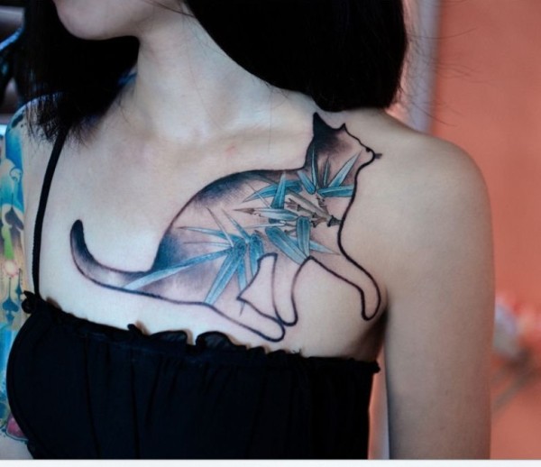 创意竹子猫咪胸部纹身图片