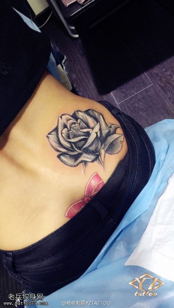 臀部黑灰玫瑰花纹身图案