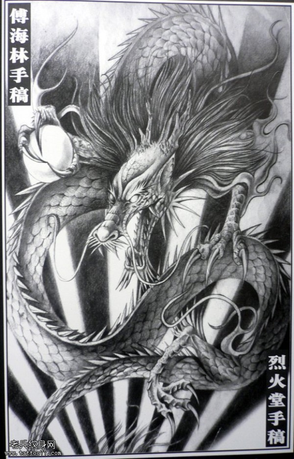 龙纹身手稿_一组老传统黑灰龙手稿纹身图案