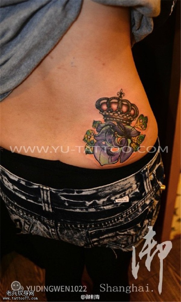 腰部彩色玫瑰花皇冠纹身图案