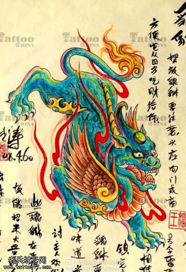 彩色个性麒麟纹身手稿图
