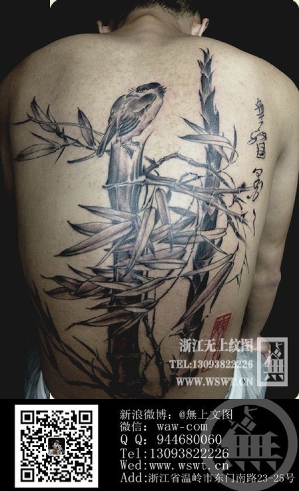 背部竹子鸟纹身