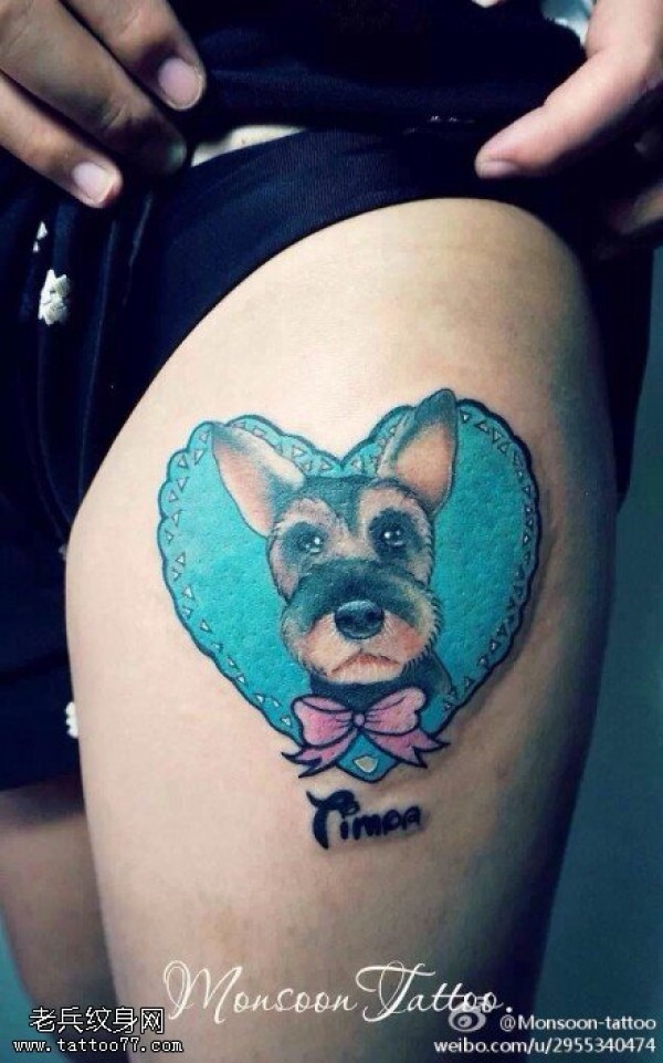 腿部彩色爱心卡通狗狗纹身图案