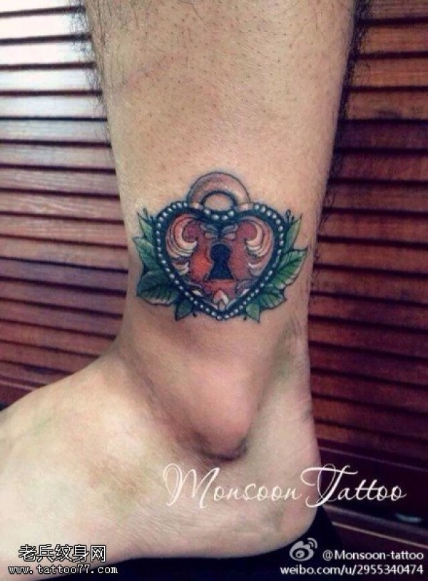 腿部彩色锁纹身图案