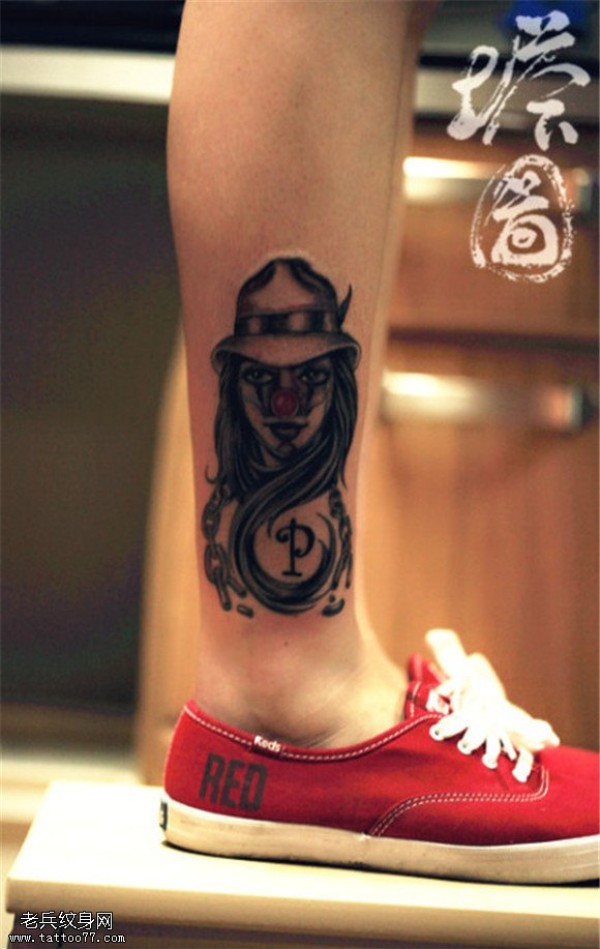 腿部小丑纹身图案