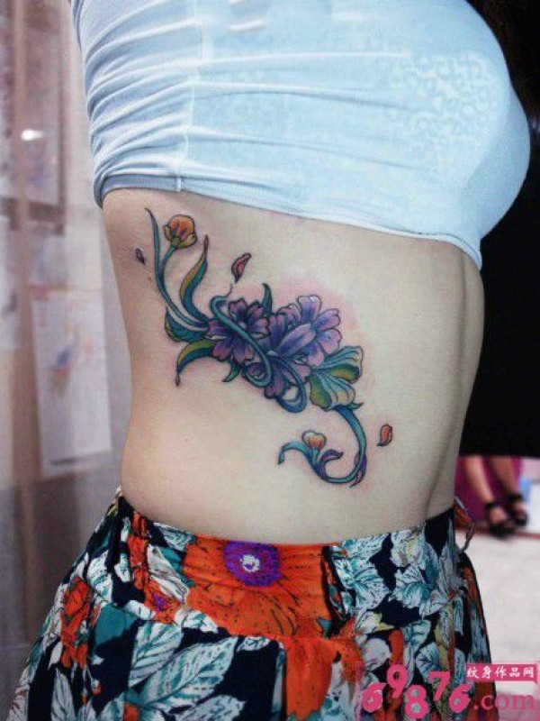 女生玲珑腰部的依兰花图案纹身女生腰部嫣红底_腰部纹身图案大全_纹身图吧