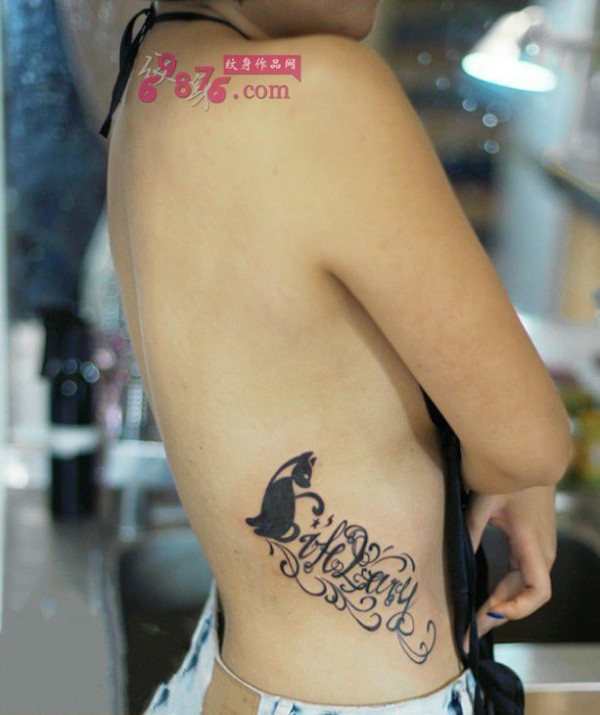 猫咪与花体英文腰部纹身图片