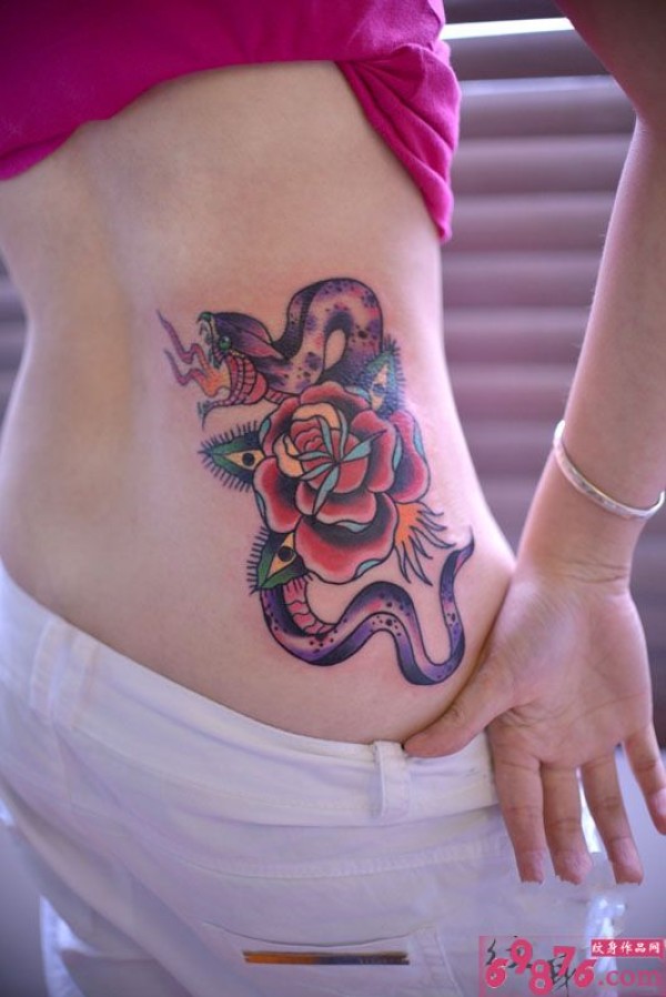 分享一款腰部时尚性感的蝶恋花纹身图案_腰部纹身图案大全_纹身图吧