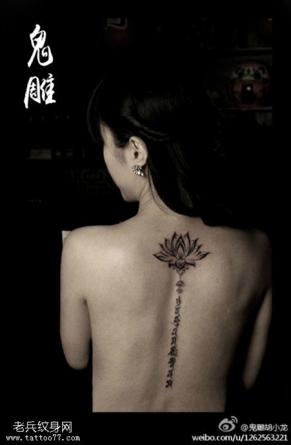 背部美丽梵莲花加梵文纹身图案