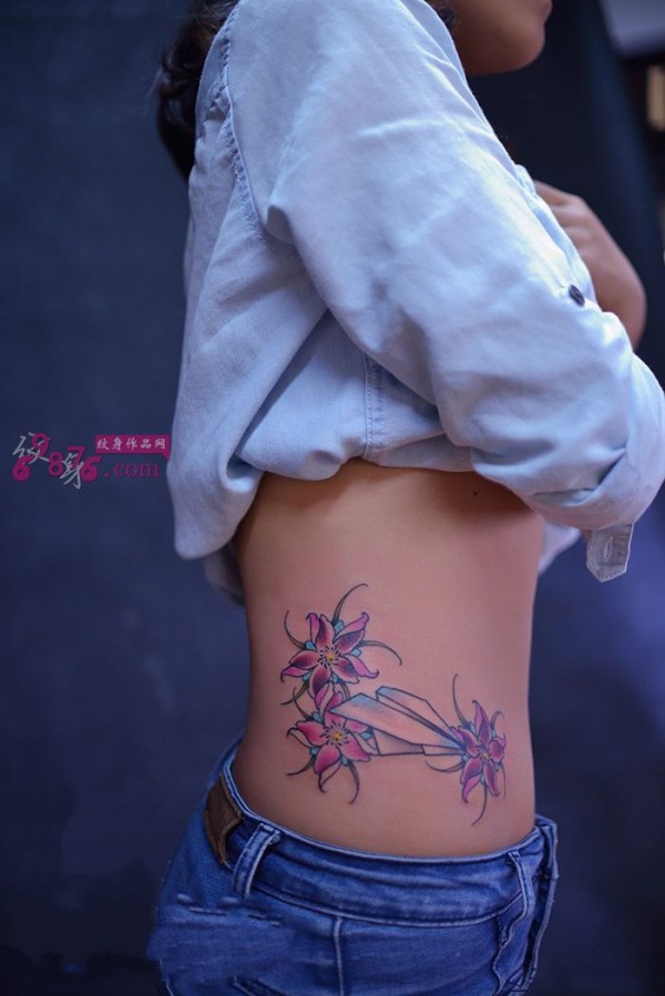 女生玲珑腰部的依兰花图案纹身女生腰部嫣红底_腰部纹身图案大全_纹身图吧