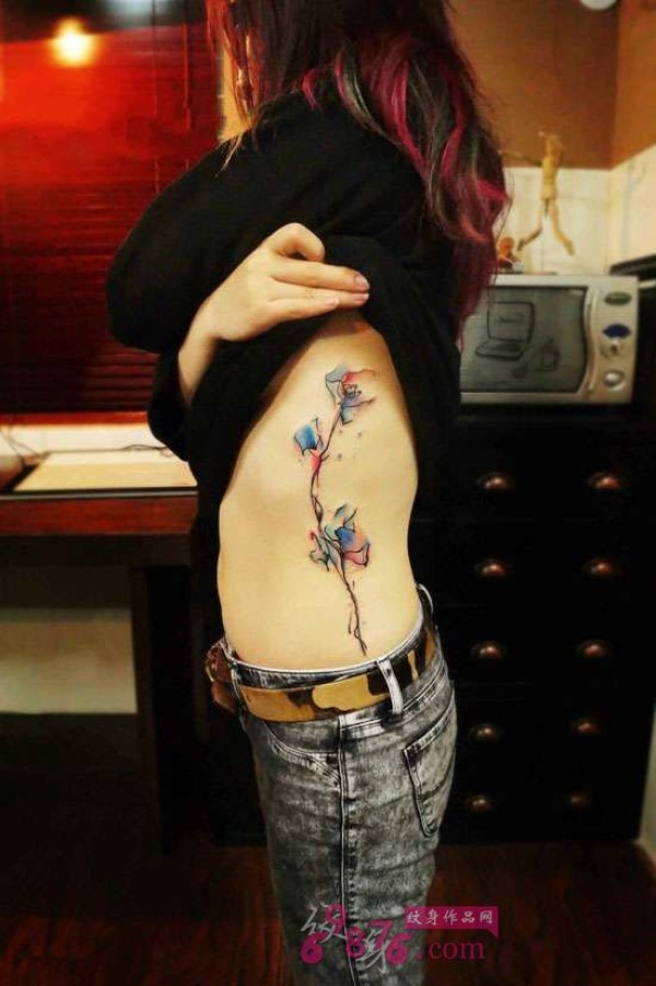 女生玲珑腰部的依兰花图案纹身女生腰部嫣红底_腰部纹身图案大全_纹身图吧