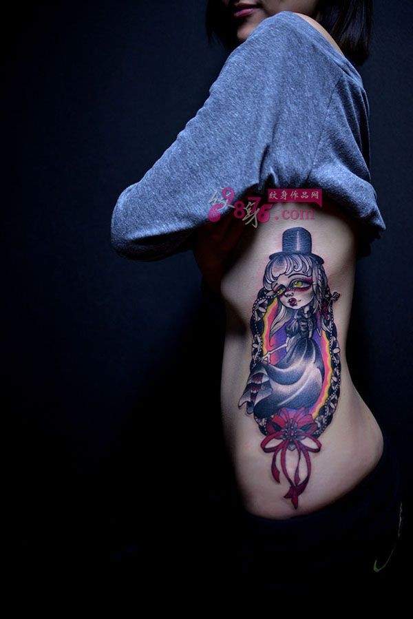 女孩侧腰个性娃娃纹身图片
