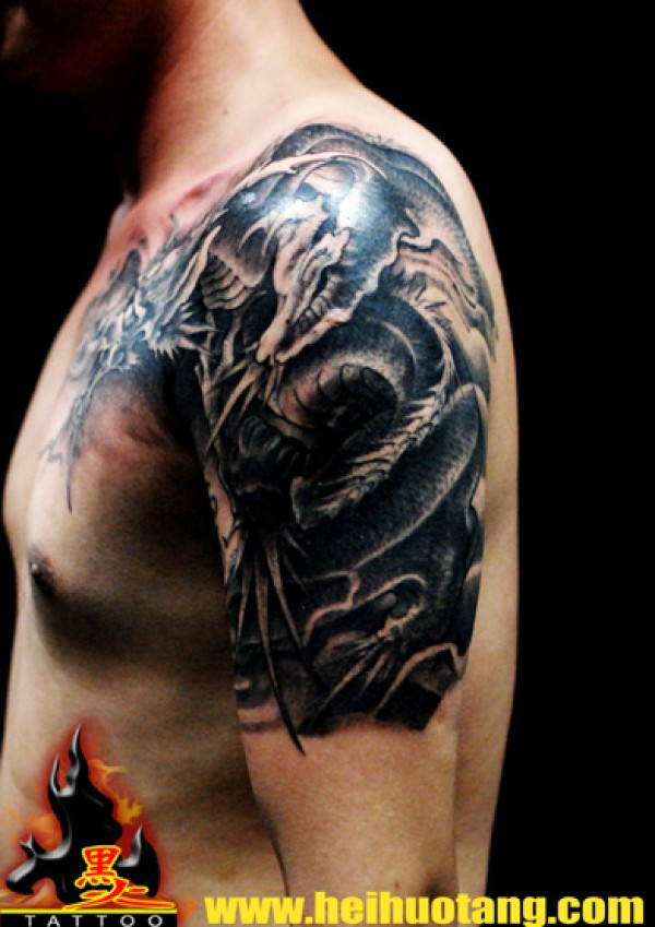 龙纹身手稿_一组老传统黑灰龙手稿纹身图案