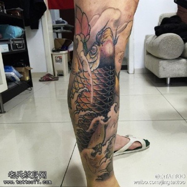 传统鲤鱼花小腿纹身_腿部纹身图案大全_纹身图吧