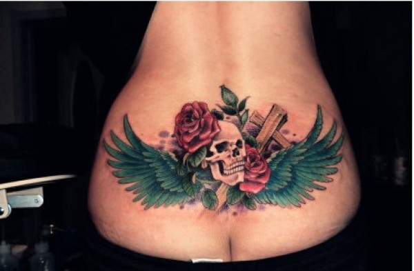 美女腰部漂亮时尚的骷髅与翅膀纹身图图片