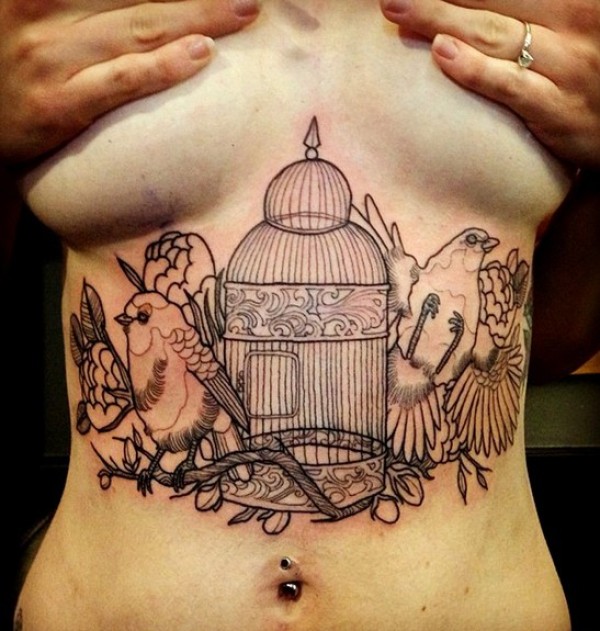 分享一款腹部时尚个性鸟笼纹身