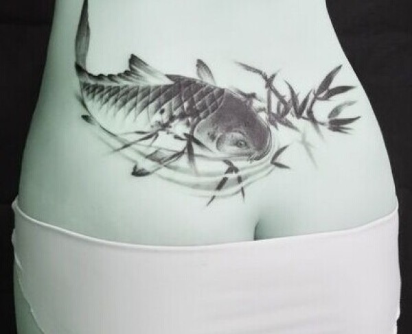 女生后腰纹身黑白灰风格抽象线条纹身图案