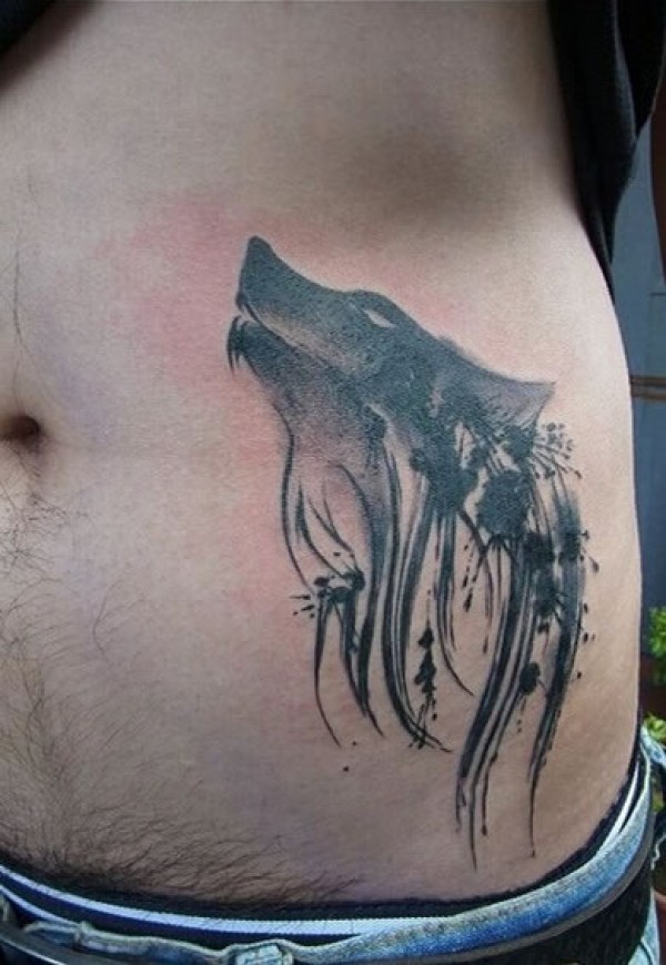 腰部犀利的水墨风格狼头纹身图图片