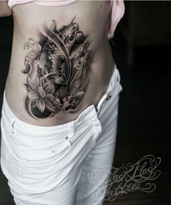 个性女性侧腰鲤鱼莲花纹身图片图片