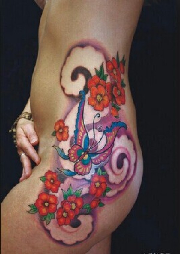 性感女生臀部唯美漂亮的蝴蝶花纹身图片