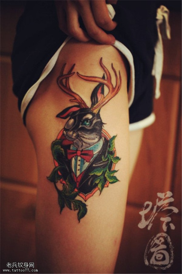 腿部彩色鹿先生纹身图片