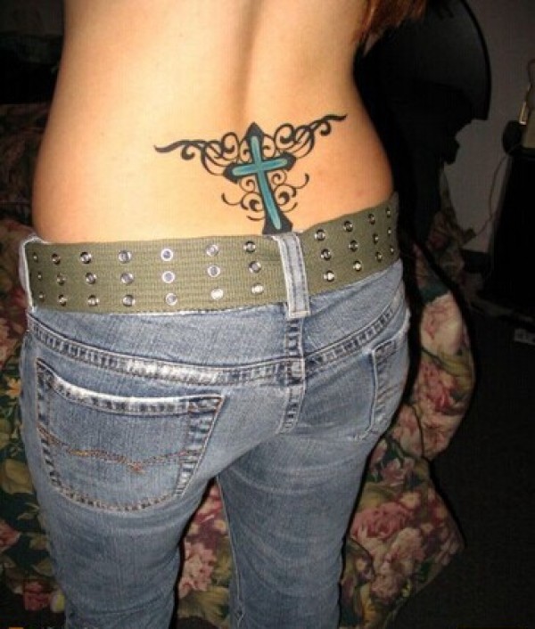 美女细腰部唯美十字架花藤纹身图片