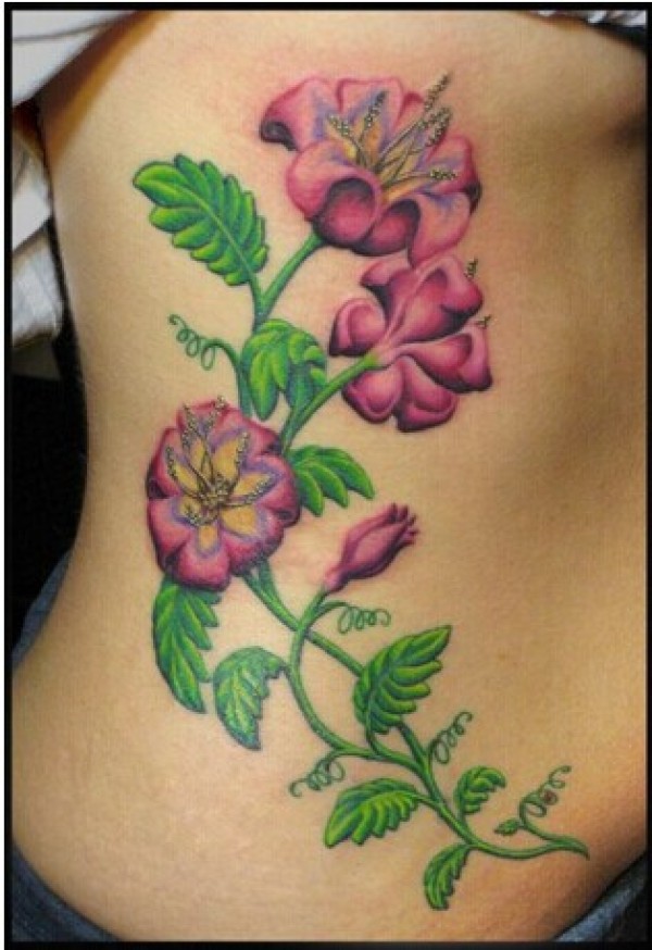 漂亮的绿叶红花女生腰部唯美纹身图图片