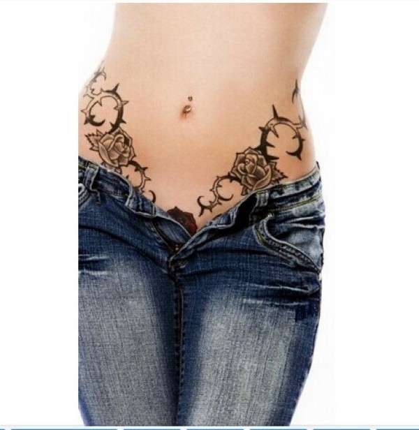 女生腰部唯美性感的牡丹花藤纹身图 图片