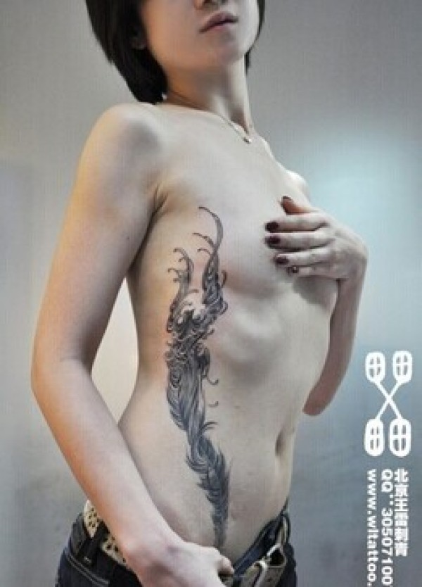 平胸美女腰部时尚唯美的凤凰羽毛纹身图片