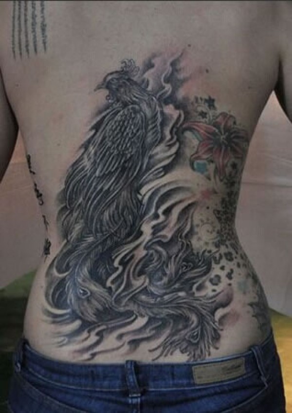 女生后腰纹身黑白灰风格抽象线条纹身图案