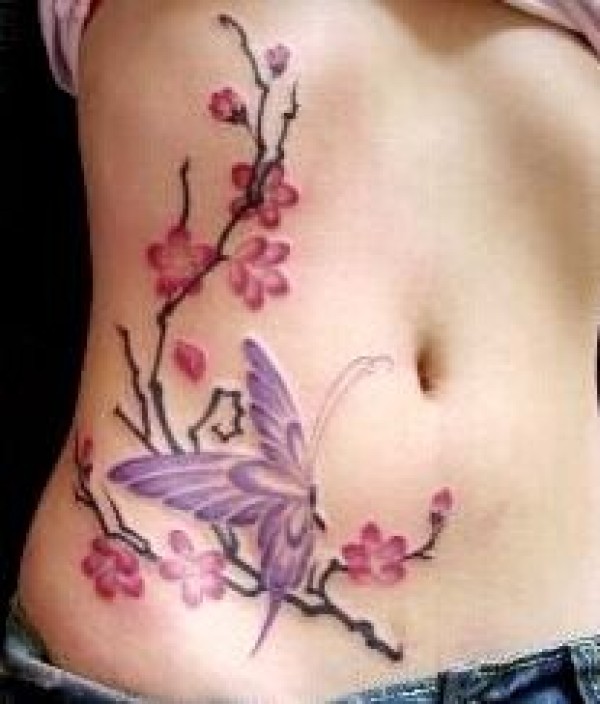 美女腰部漂亮性感的蝴蝶桃花纹身图片