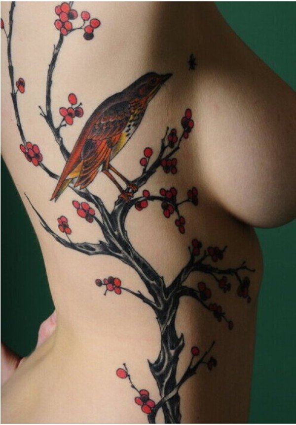 美女侧腰部位经典性感梅花喜鹊纹身图图片