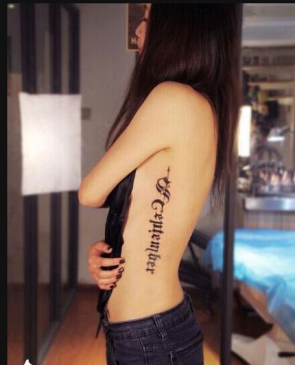 性感女生侧腰哥特字母纹身