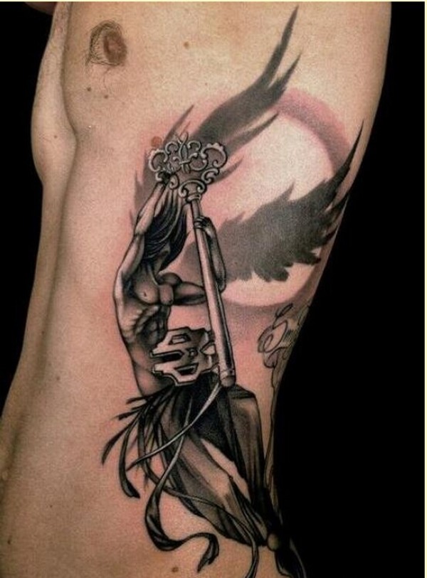 个性侧腰时尚天使钥匙纹身图案分享图片