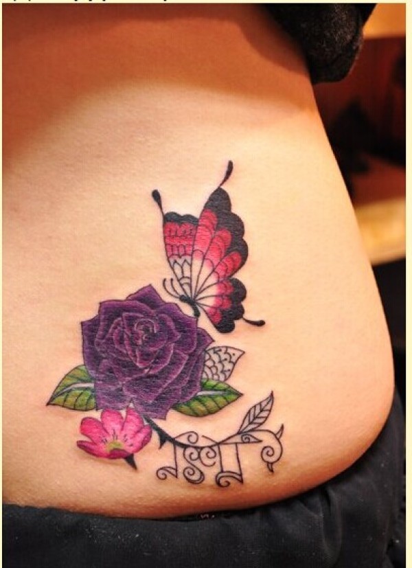 个性美女腰部漂亮蝴蝶玫瑰纹身图案