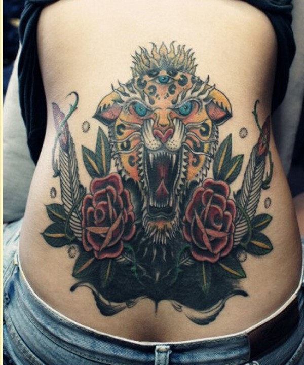 时尚女生腰部个性金钱豹玫瑰花纹身图图片