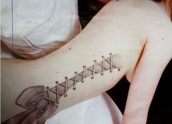 女生后腰纹身黑白灰风格抽象线条纹身图案
