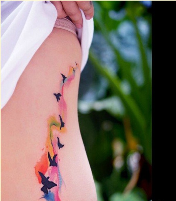 女生侧腰漂亮好看的彩色水墨燕子纹身图片