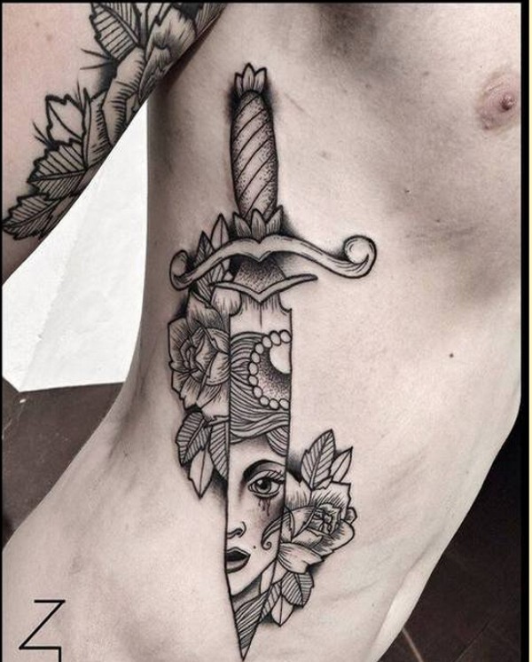时尚男士侧腰好看的玫瑰花匕首纹身图图片