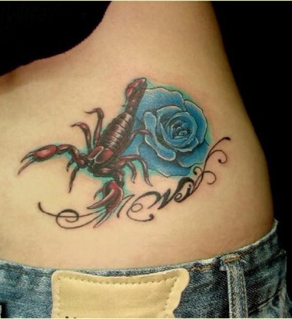 个性腰部时尚好看的彩色蝎子玫瑰纹身图片