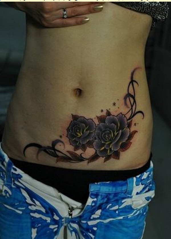 美女腹部时尚好看的花卉藤蔓纹身图案