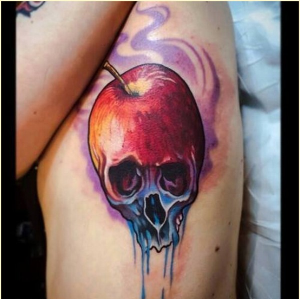 个性时尚侧腰彩色苹果骷髅纹身图案