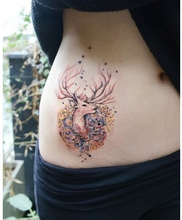 时尚女生腹部精美好看的彩色羚羊纹身图片