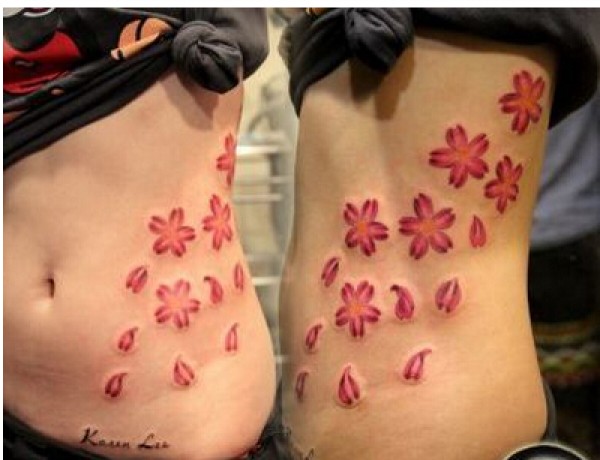 美女腹部到侧腰时尚好看的樱花纹身图图片