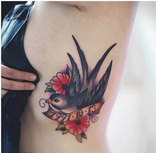 女生侧腰漂亮好看的彩色燕子花纹身图图片