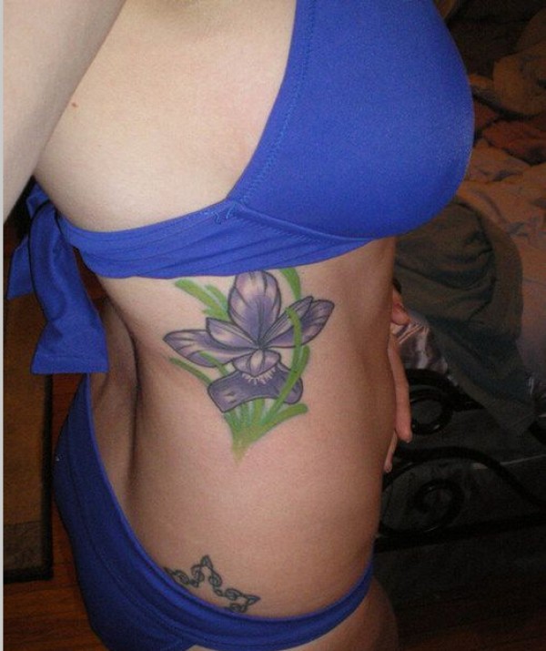 性感妹子腰部紫色漂亮的兰花纹身图案