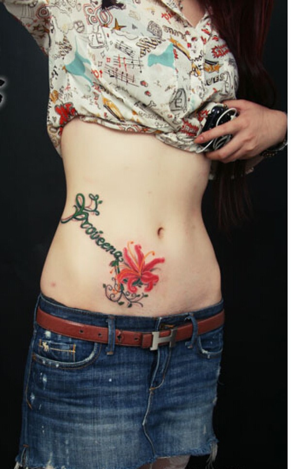 女生玲珑腰部的依兰花图案纹身女生腰部嫣红底_腰部纹身图案大全_纹身图吧